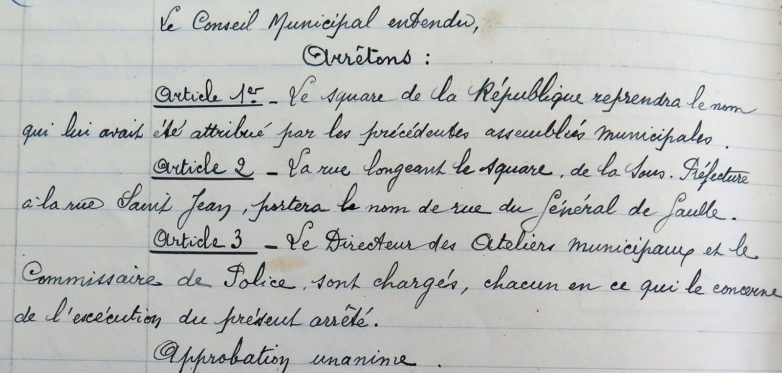 Les promenades seront dénommées "Square de la république" vers 1900. La rue qui longe ce square (ou se trouve la mairie et la sous-préfecture ) prit le nom de "Châteaudun" vers 1880.
