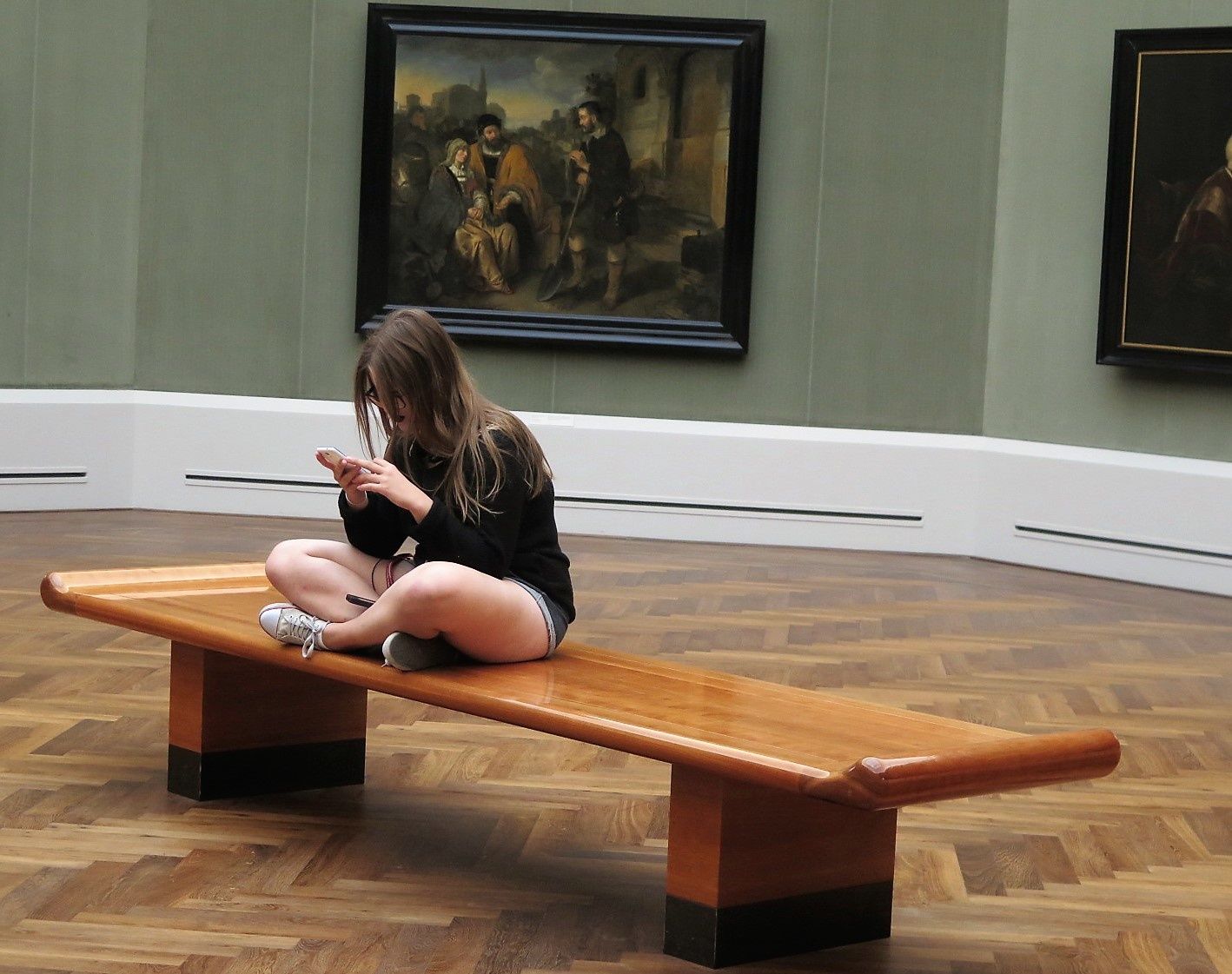 Quelques minutes plus tard une autre jeune fille est venue s'installer en tailleur sur le banc. Réprimandée par un gardien, en s'asseyant normalement elle a continué sa conversation smartphonienne.
